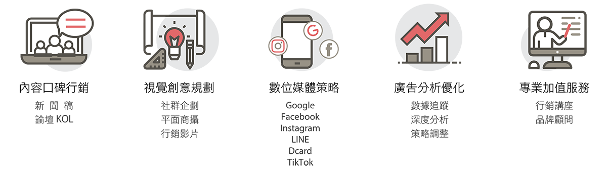 我們可為您提供全方位數位行銷服務從 Google、Facebook、Instagram、LINE、LINE OA、Dcard、TikTok 到社群、影像、口碑論壇、新聞稿以及KOL行銷,致力於用創新方式,幫助您擴展品牌影響力並深化與目標受眾的連結