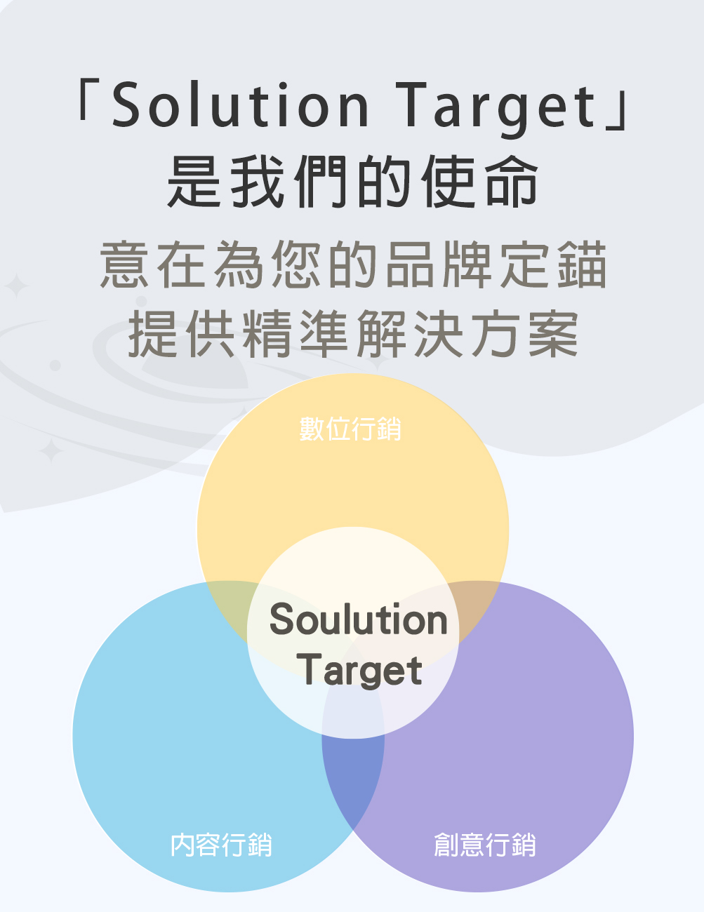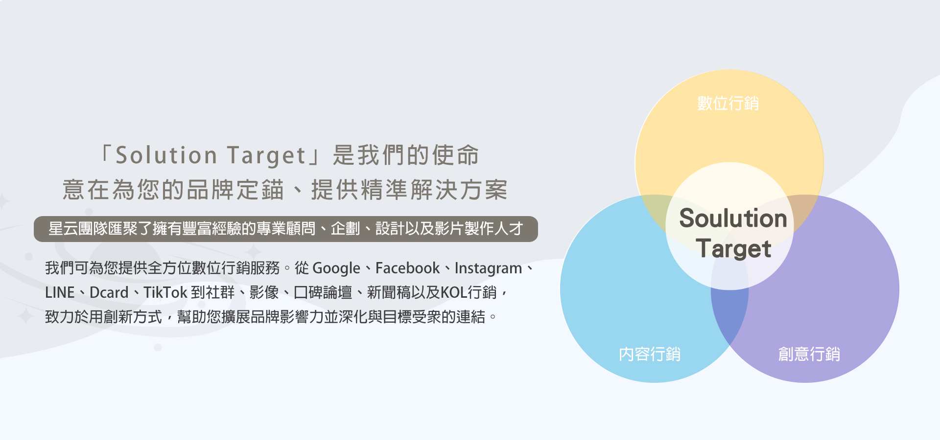 星云數位ST Cloud「Soulution Target」是我們的使命,意在為您的品牌定錨、提供精準解決方案。星云團隊匯聚了擁有豐富經驗的專業顧問、企劃、設計以及影片製作人才。我們可為您提供全方位數位行銷服務。從Google、Facebook、Instagram、LINE、Dcard、TikTok到社群、影像、口碑論壇、新聞稿以及KOL行銷,致力於用創新方式,幫助您擴展品牌影響力並深化與目標受眾的連結。介紹1.數位行銷透過多種工具擴展品牌影響力、提高曝光、與目標受眾建立互動,並獲取利益。2.內容行銷透過提供「有價值的內容」吸引、留下目標受眾,建立品牌聲譽、提高可信度。3.創意行銷透過獨特創新手法獲得情感共鳴,進而提高品牌識別度,並與目標受眾建立深層次連結。